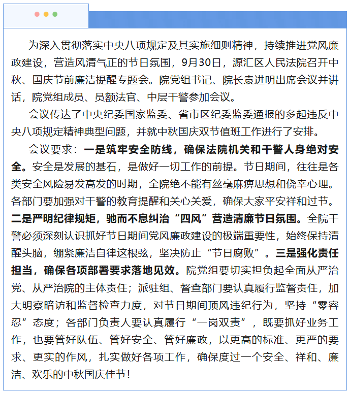 源汇区人民法院召开中秋、国庆节前廉洁提醒专题会