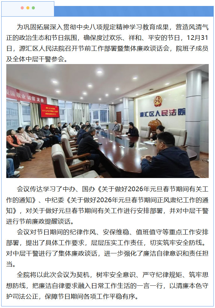 源汇区人民法院召开节前工作部署暨集体廉政谈话会